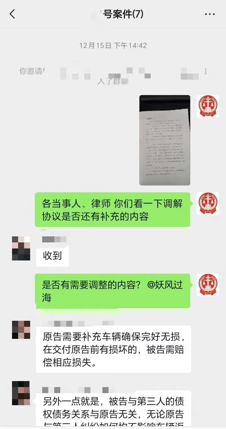沟通的场域,从电话延伸到微信群。调解方案在一次次“拉锯”中逐渐清晰:车辆返还周某,由他自行办理过户;张某赔偿周某部分损失;而王某则须分期偿还欠张某的借款,并承担相应责任。