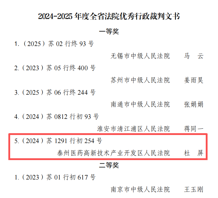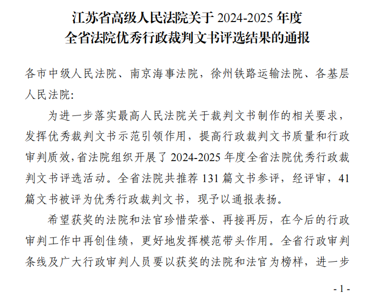 近日,江苏省高级人民法院公布了2024-2025年度全省法院优秀行政裁判文书评选结果。全省法院共推荐 131 篇文书参评,经评审,41篇文书被评为优秀行政裁判文书。我院行政审判团队的两篇裁判文书分别荣获一等奖和二等奖。