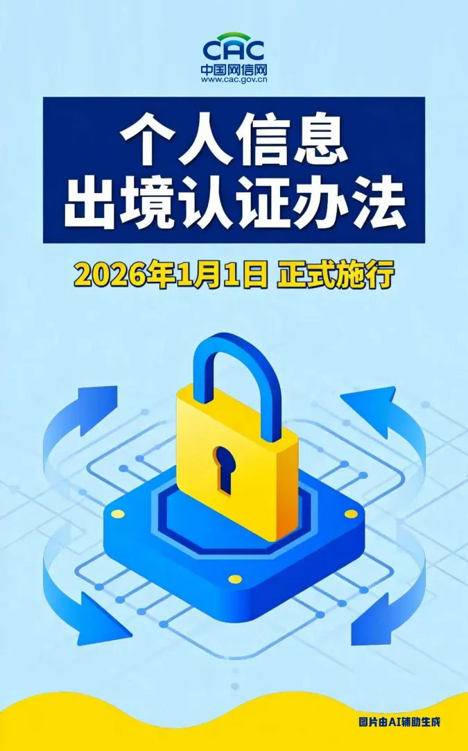 2025年10月14日,国家互联网信息办公室、国家市场监督管理总局联合公布《个人信息出境认证办法》,自2026年1月1日起施行。