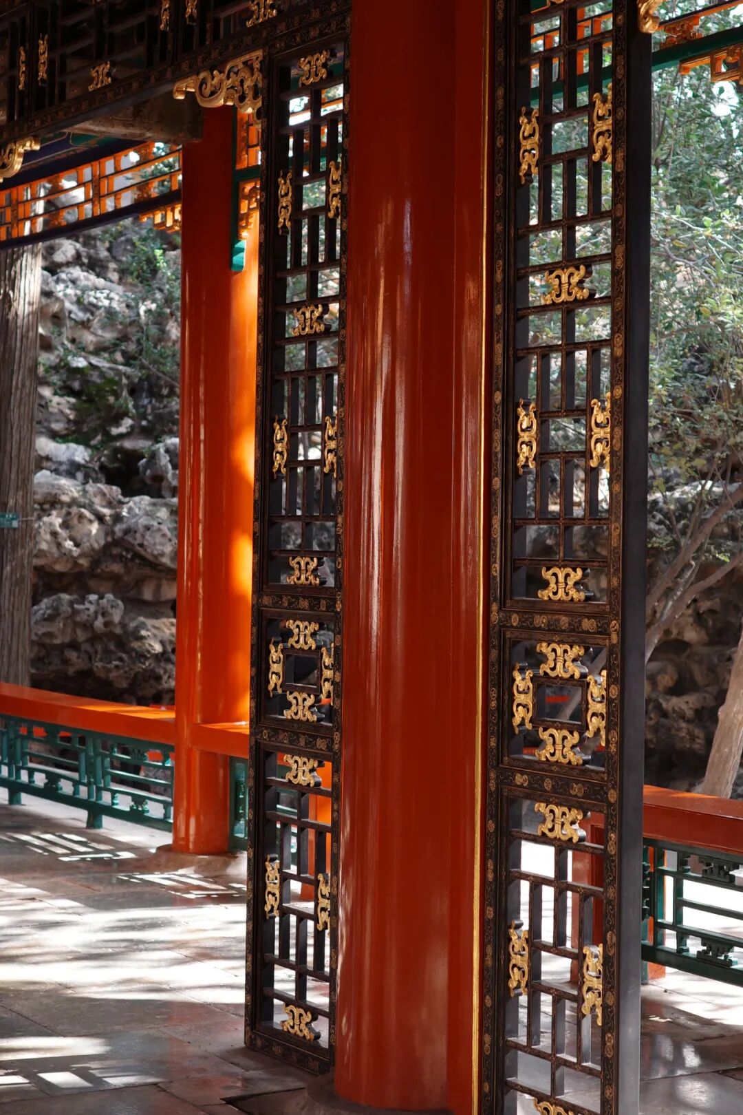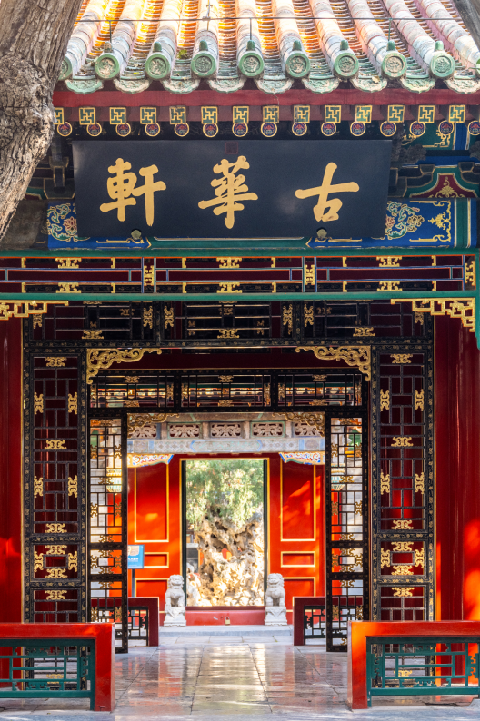 古华轩是乾隆花园第一进院落的主体建筑,内外通透,四面不设门窗。金柱间环绕着一圈精美的黑漆描金落地罩,以柏木为胎,施以黑漆描金皮球纹与卷草枝条纹,是中国北方地区罕见的将大漆工艺应用于半室外建筑装饰的案例。