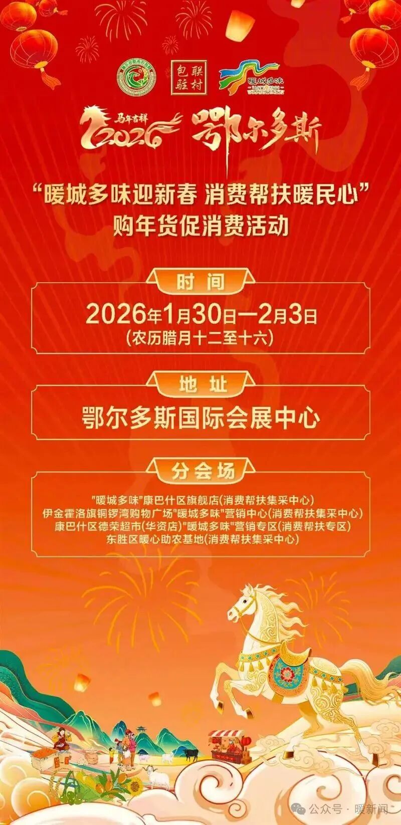 ▪ 活动时间:1月30日-2月3日(农历腊月十二至十六),共计5天。▪ 主会场:鄂尔多斯国际会展中心(康巴什区),其中A馆为产品展销区,B馆为启动仪式、主题日活动、美食品鉴、现场烹饪区。▪ 分会场:“暖城多味”康巴什区旗舰店(消费帮扶集采中心)、伊金霍洛旗铜锣湾购物广场“暖城多味”体验店(消费帮扶集采中心)、康巴什区德荣超市(华资店)“暖城多味”体验店(消费帮扶专区)、东胜区暖心助农基地(消费帮扶集采中心)、鄂尔多斯“暖城多味”京东旗舰店(京东特产馆线上平台)。