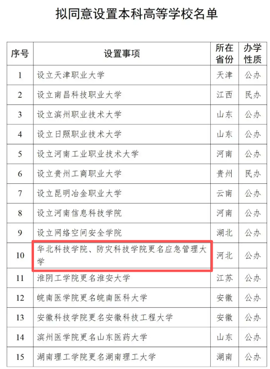 2026年1月4日,教育部发布《关于拟同意设置本科高等学校的公示》。其中,拟同意华北科技学院、防灾科技学院更名为应急管理大学。这是全国第一所以“应急管理”命名的高校。