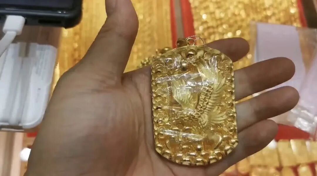 记者发现,张先生在社交平台的个人账号中,有许多他戴着金牌在外面游玩的视频。2024年4月30日,他还发视频记录了当时购买这块金牌的过程。视频显示,当时他在黄金柜台看中了一块图案是大鹏展翅的金牌,当即就付款买下。发票显示,他买的这块足金999金牌吊坠重80余克,花费5万多元,当时单价为578元/克。