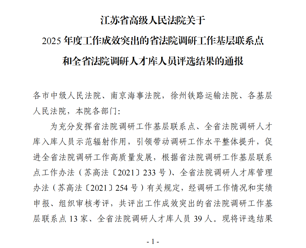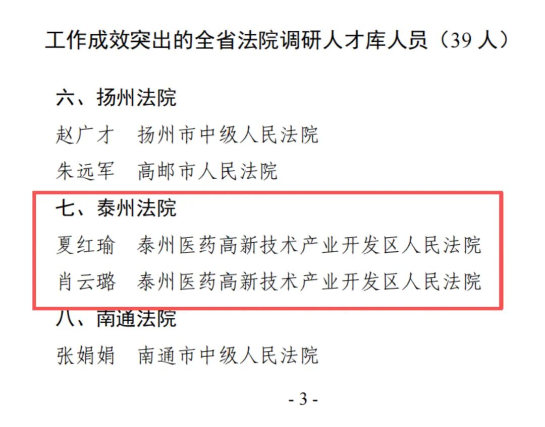 近日,江苏省高院发布了关于2025年度工作成效突出的省法院调研工作基层联系点和全省法院调研人才库人员评选结果。其中,泰州医药高新区法院夏红瑜、肖云璐被评为工作成效突出的全省法院调研人才库人员。