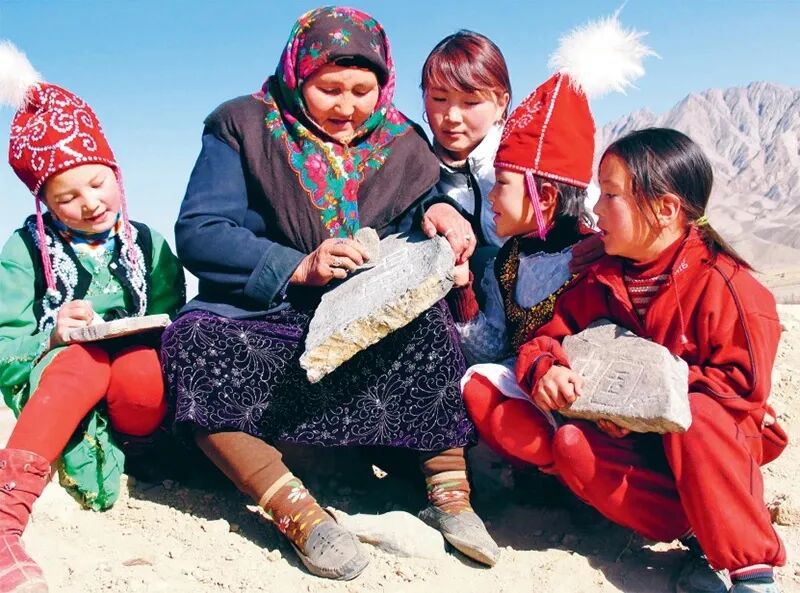 图为布茹玛汗·毛勒朵在边境线上教孩子们刻“中国石”。