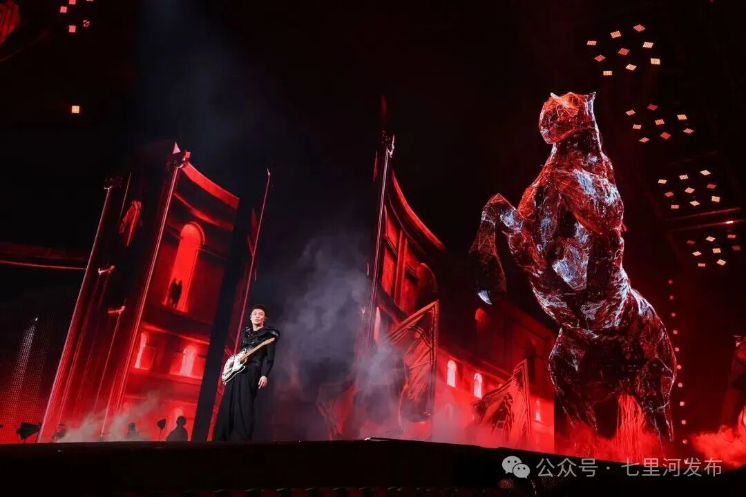 一座巨型黑马艺术装置,以策马奔腾之势伫立在舞台的绝对中心。