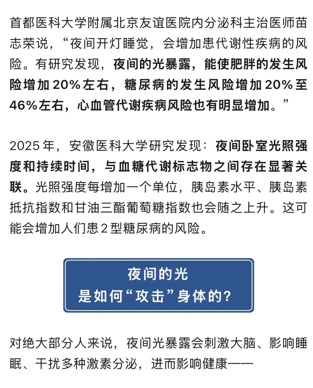 睡觉前刷会儿手机、怕黑留盏灯……这些再平常不过的习惯,很多人每天都在做,殊不知,晚上的这些光线,会让你的血糖、血管都“受伤”。