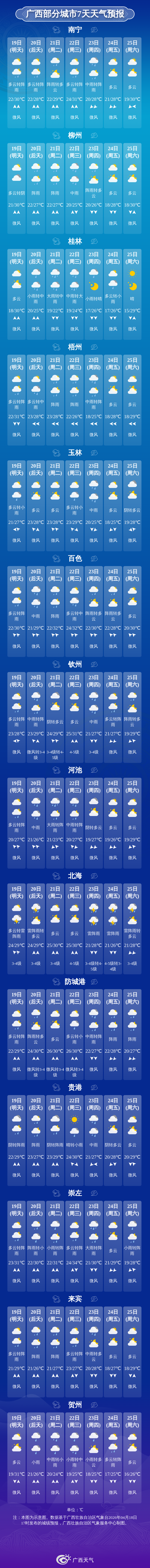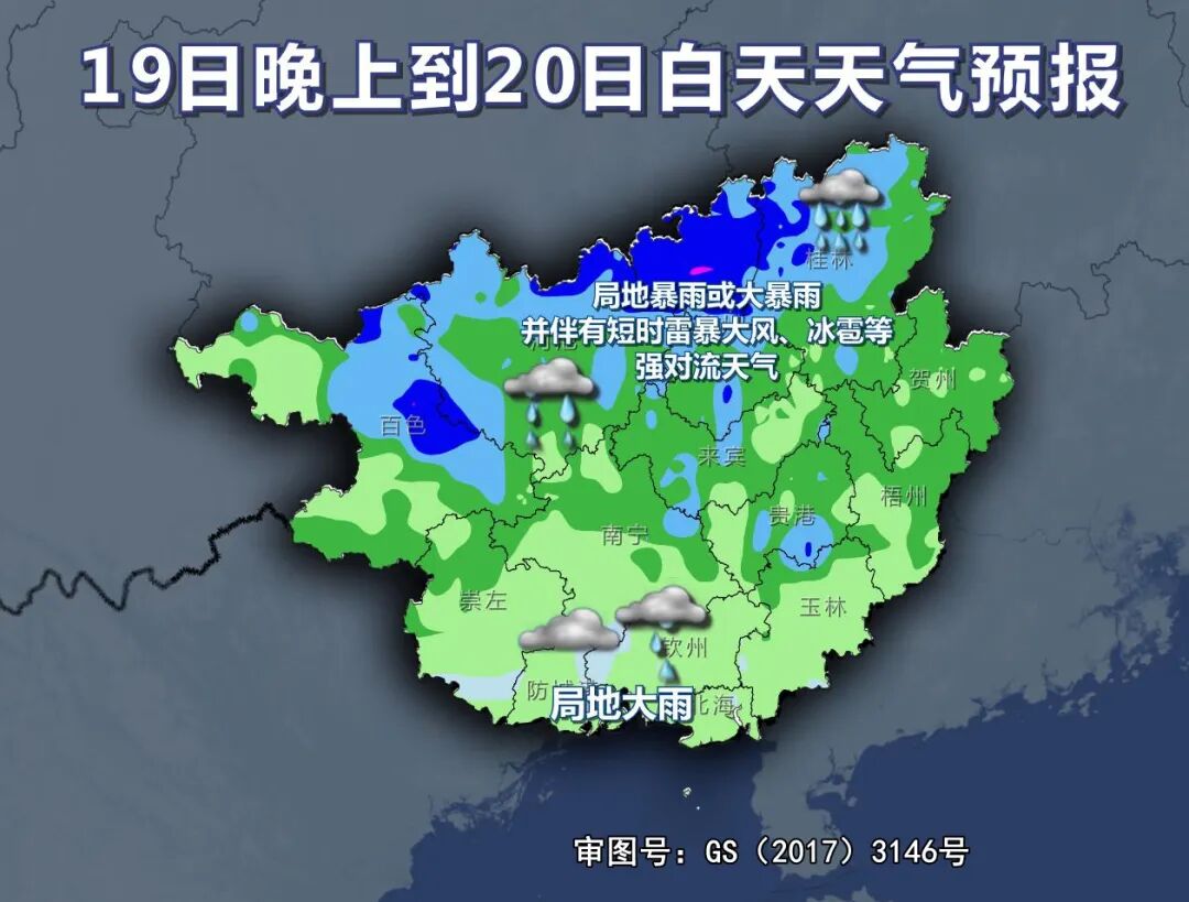 19日晚上到20日白天,桂北、桂中有中到大雨、局地暴雨或大暴雨并伴有短时雷暴大风、冰雹等强对流天气,桂南阴天有小雨、局地大雨。