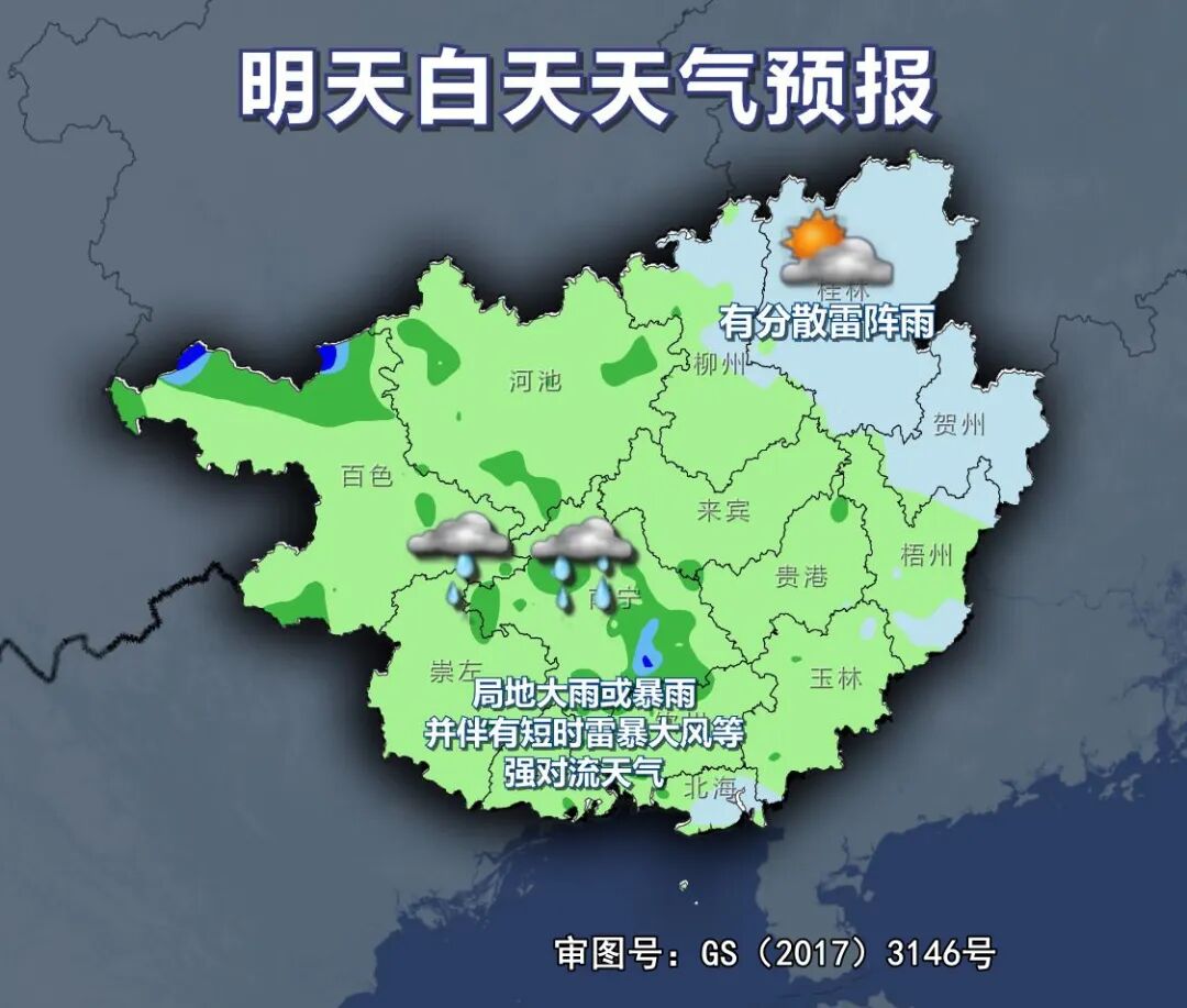 明天白天,百色、河池、崇左、南宁、防城港、钦州等市有小到中雨、局地大雨或暴雨并伴有短时雷暴大风等强对流天气,其它地区多云有分散雷阵雨。