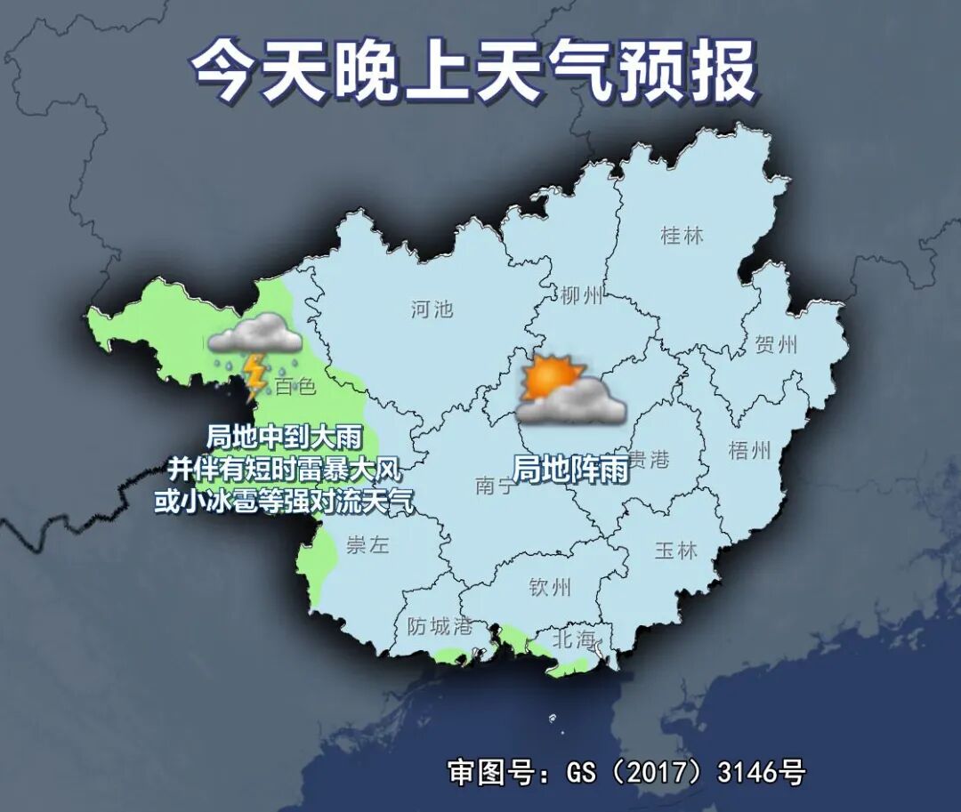 今天晚上,百色、崇左等市有雷阵雨、局地中到大雨并伴有短时雷暴大风或小冰雹等强对流天气,其它地区多云、局地阵雨。