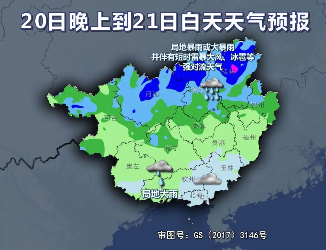 20日晚上到21日白天,桂北部分地区有大雨、局地暴雨或大暴雨并伴有短时雷暴大风、冰雹等强对流天气,其它地区阴天有小雨、局地大雨。