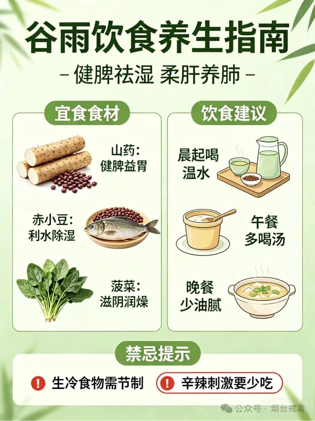 避免生冷:谷雨时节气温虽有上升,但阳气尚处于生发状态,应避免过早食用冷饮,以免刺激胃肠、滞留湿气,引起脾胃不适。