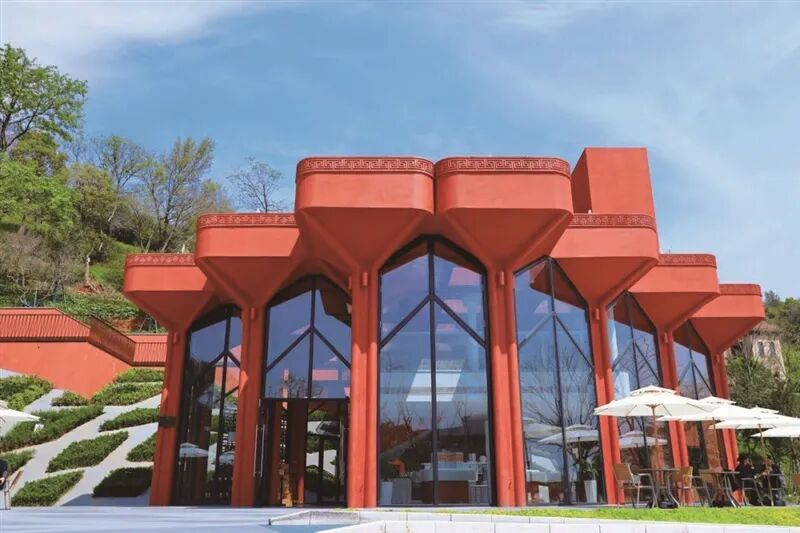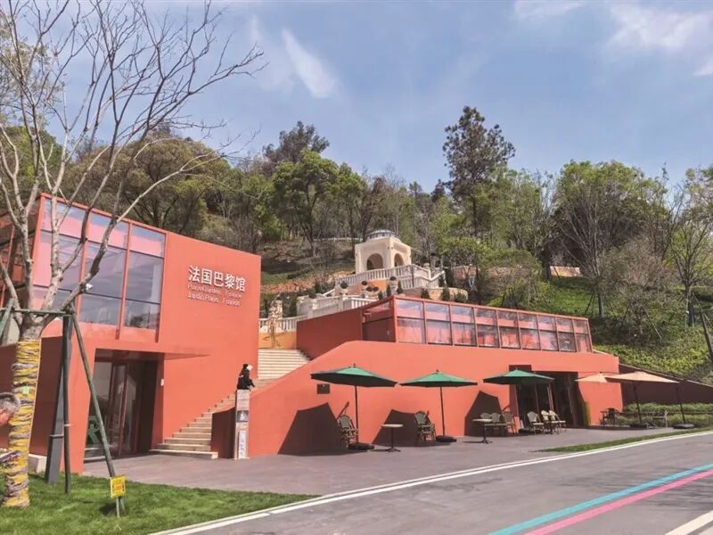 古典园林与现代艺术碰撞,以“马蒂斯红”为设计语言,南北轴线串联喷泉水景、观景平台,台阶式绿化营造浪漫纵深感。法国馆有红酒品鉴、进口化妆品展陈,运营单位还提供了咖啡、面包,有兴趣的市民可以去品鉴。
