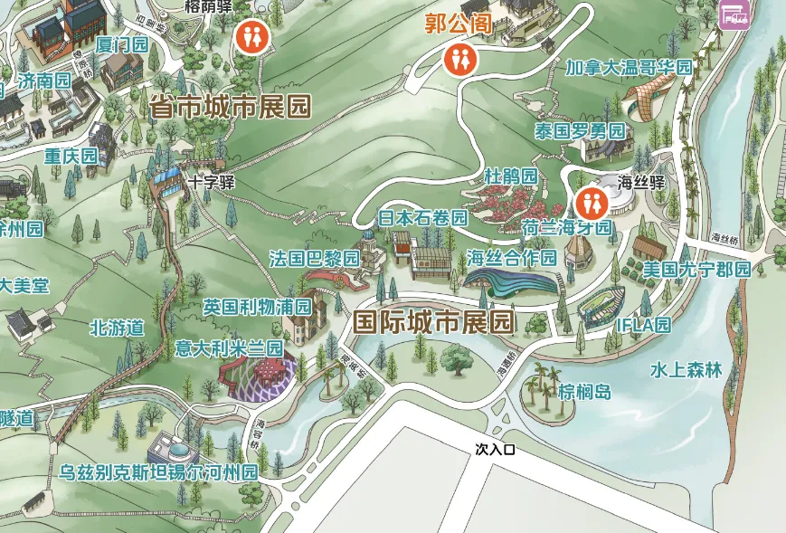 国际城市展园主要分布于北园仙门山南麓,建议从北园入口进入。沿时光隧道-中亚风情区-欧洲风情区-海丝核心区-东南亚及美洲区依次游览,全程约2—3小时,可串联老虎山制高点大美堂,360度俯瞰全园风光。