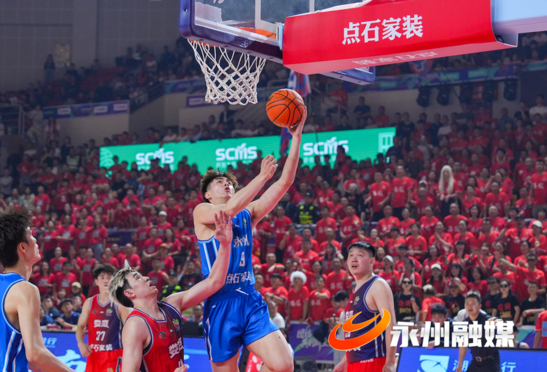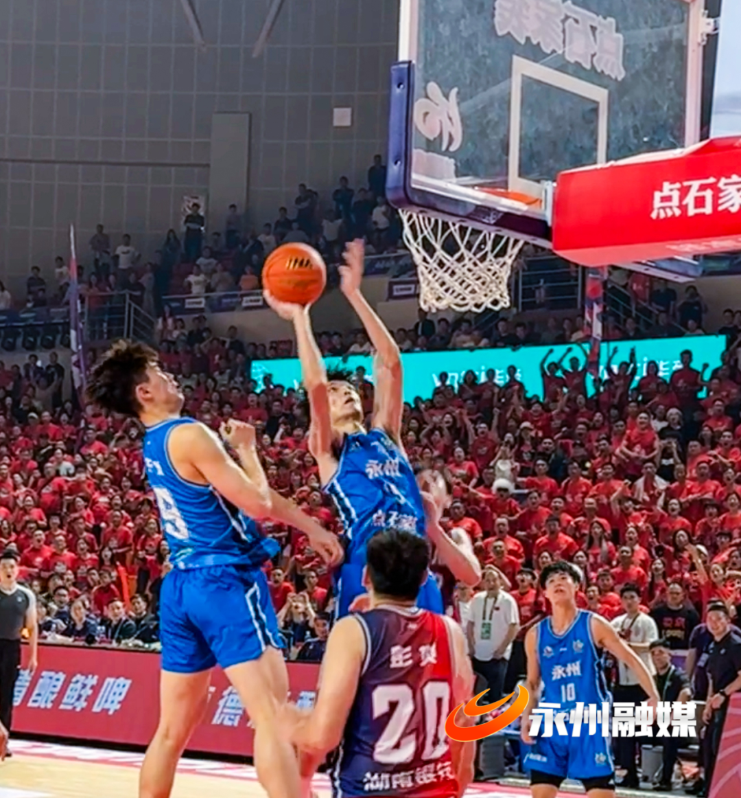 球权在永州队手中。第一次进攻,没进;第二次,还是没进。时间在飞速流逝,观众席上已经有人捂住了眼睛。还剩5秒,第三次进攻,球飞过篮筐上空——一道蓝色的身影从人群中高高跃起,补篮、球进。