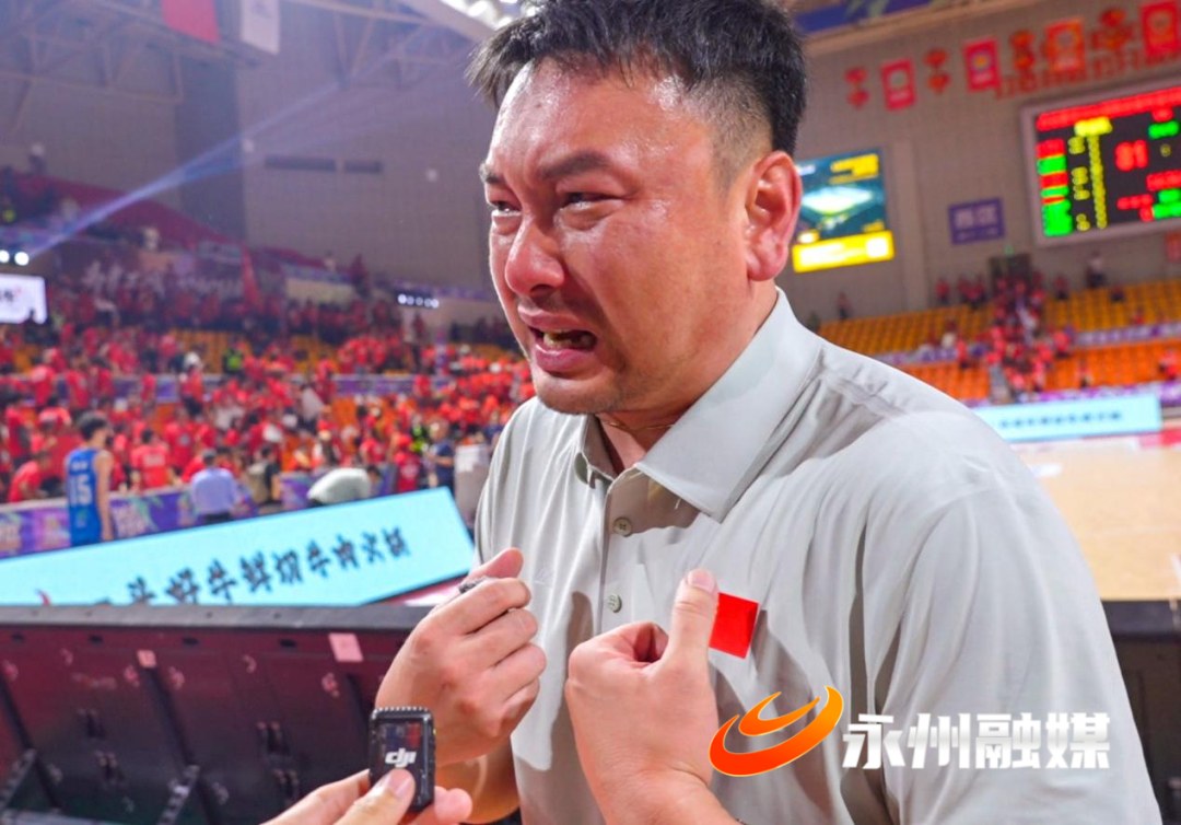 赛后,我们采访到永州队主教练袁野,他的声音几乎是颤抖着挤出来的。他红着眼圈,努力让自己镇定,却还是没能忍住那几声哽咽。这位40多岁的中年男人,此刻像个孩子一样,对着镜头反反复复说着“感谢,感谢一直支持我们的人”。