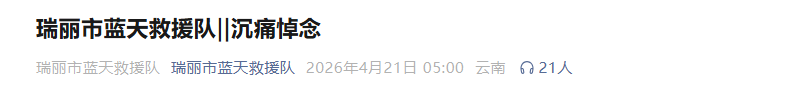 4月21日,据云南省瑞丽市蓝天救援队消息,4月20日凌晨四时许,该队队员陈延寿同志在香格里拉市哈巴雪山大本营区域(海拔4300米)执行搜救任务中突发状况。现场同行队员第一时间给予吸氧并根据状态发展不间断进行心肺复苏、人工呼吸等全套专业急救措施。凌晨5时许,陈延寿不幸遇难,年仅39岁。