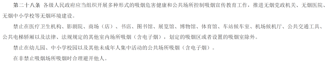 新修订的《四川省烟草专卖条例》第四条显示:全社会应当加强吸烟危害健康的宣传教育。禁止或者限制在公共交通工具和公共场所吸烟,禁止中小学生吸烟。