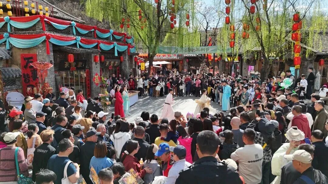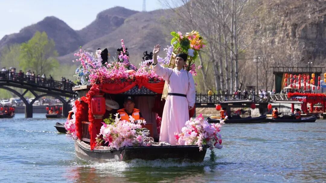花神身着雅致国风服饰、背着花篓,先沿易水河乘花船巡游,再穿梭于水镇街区,仙气飘飘、春意盎然,沿途与游客亲切互动,让大家沉浸式感受这场浪漫的国风盛宴。