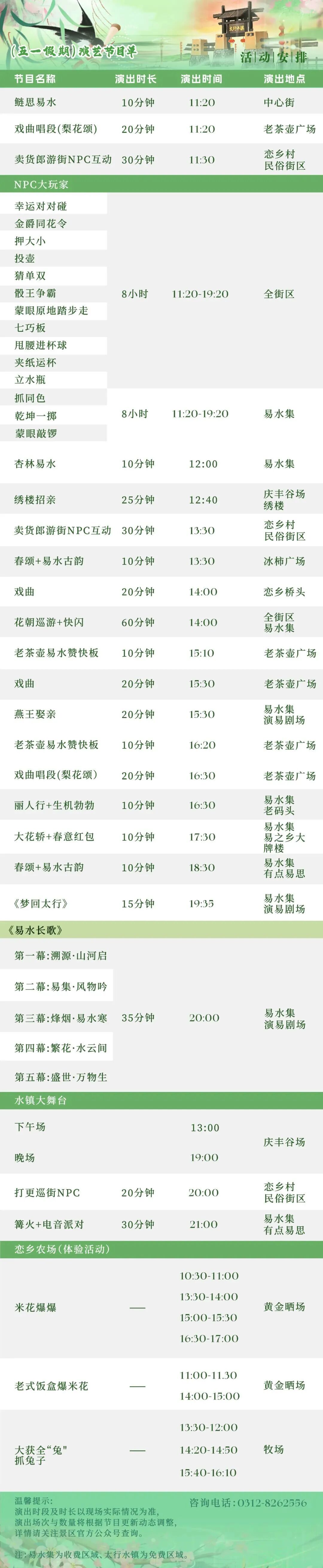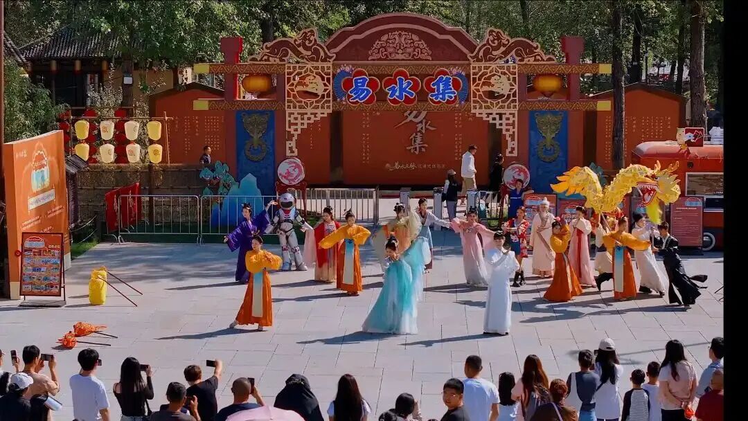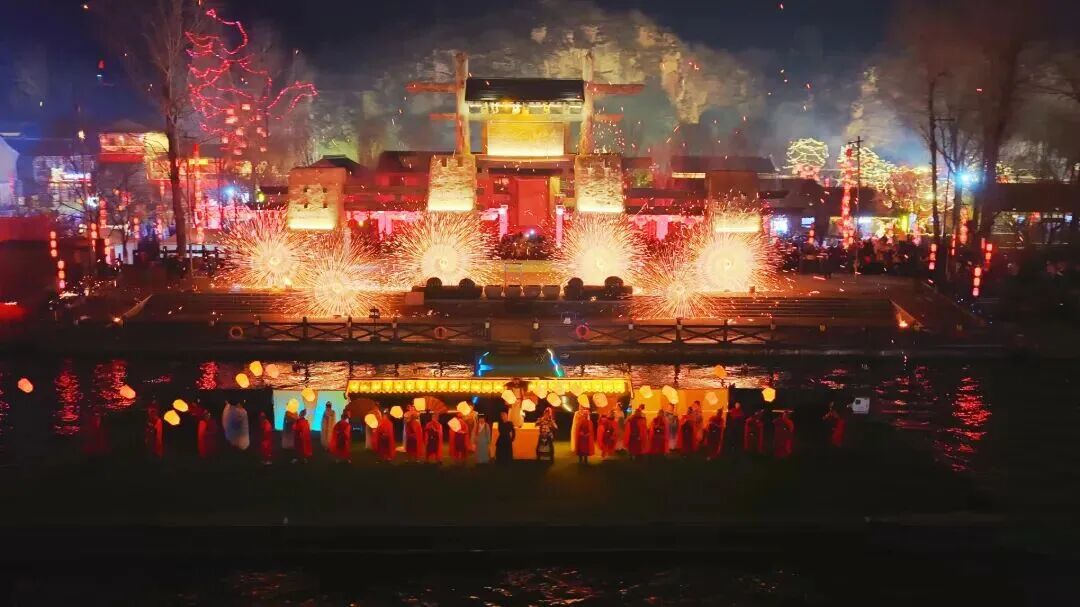 演出分为溯源·山河启、易集·风物吟、烽烟·易水寒、繁花·水云间、盛世·万物生等五幕,搭配非遗打铁花、火壶表演,辅以水幕光影特效,由老守河人娓娓讲述千年易水的传奇故事。