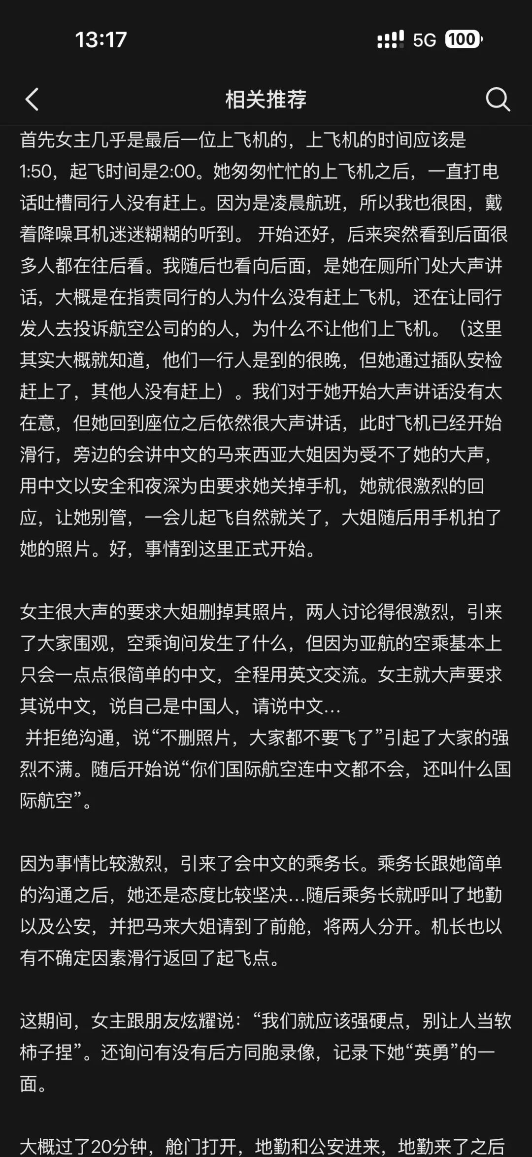 该女子自称是某航空姐,大声质疑“国际航班的机组为什么连中文都不会说”,要求机组删除视频、向她道歉,并索要机票报销及赔偿。她坚称自己的通话行为并未影响飞行安全,所诉求的仅为“删除视频”和“合理解释”。