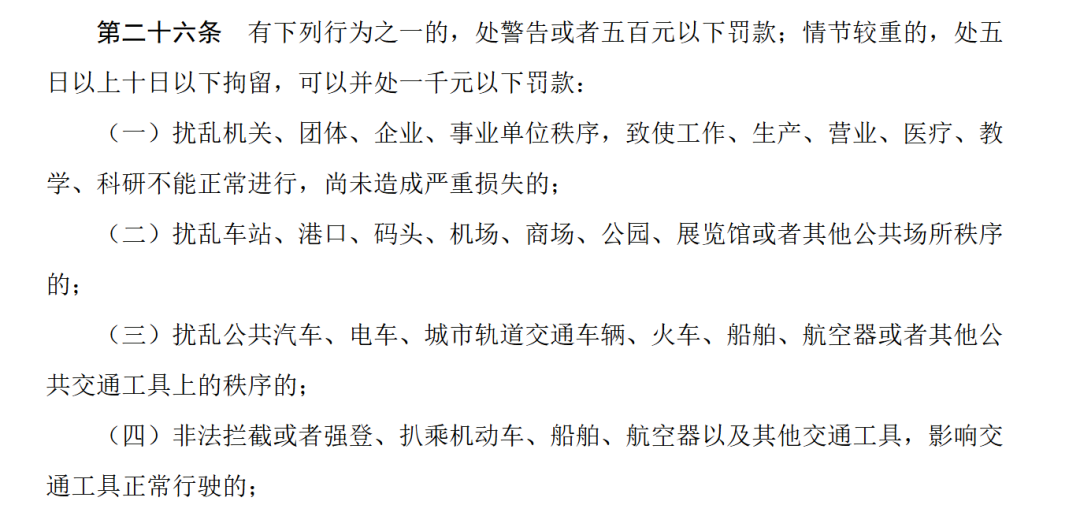 《治安管理处罚法》第二十六条明确规定,扰乱公共汽车、电车、城市轨道交通车辆、火车、船舶、航空器或者其他公共交通工具上的秩序的,处警告或者五百元以下罚款;情节较重的,处五日以上十日以下拘留,可以并处一千元以下罚款。