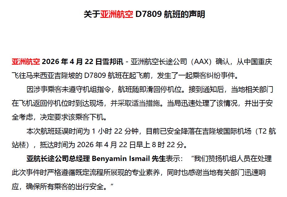 亚航长途公司总经理Benyamin Ismail先生表示:“我们赞扬机组人员在处理此次事件时严格遵循既定流程所展现的专业素养,同时也感谢当地有关部门迅速响应,确保所有乘客的出行安全。”