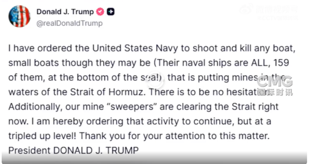 另据@CCTV国际时讯 消息,特朗普称,他已下令美国海军“对于任何在霍尔木兹海峡水域布设水雷的船只,哪怕只是小型船只,也一律予以开火击沉”。