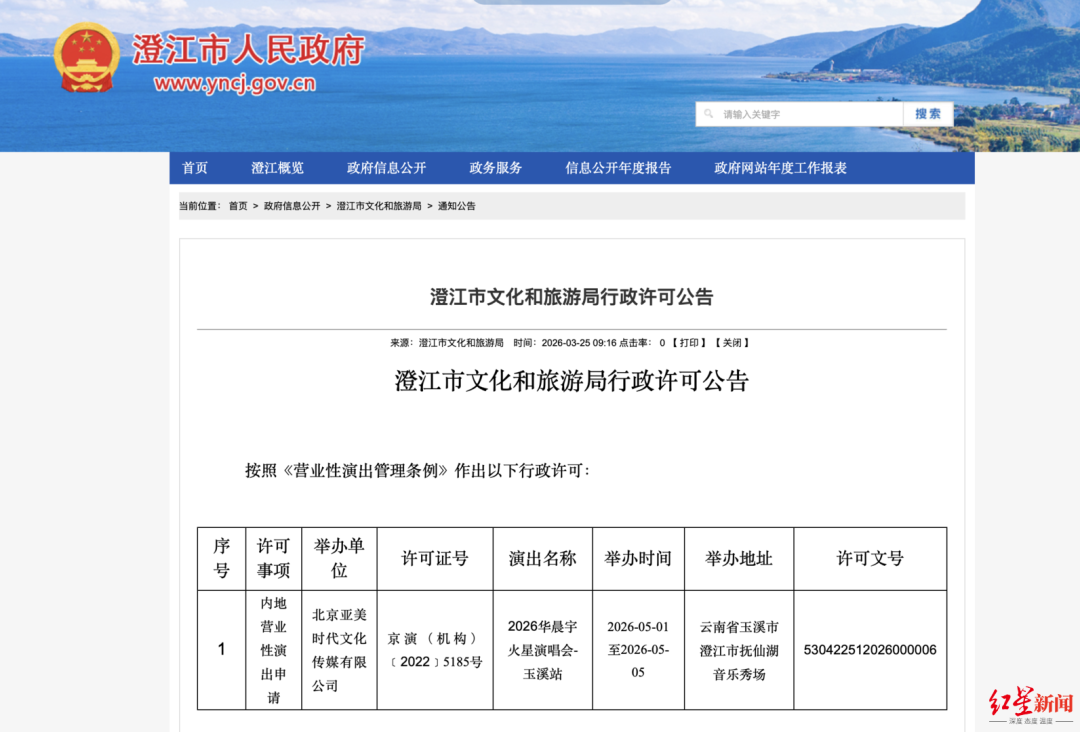 今年3月25日,“华晨宇火星演唱会·玉溪站”通过行政审批。澄江市人民政府官网显示,澄江市文旅局发布行政许可公告,通过“2026华晨宇火星演唱会-玉溪站”营业性演出申请,举办单位为北京亚美时代文化传媒有限公司,举办地址为云南省玉溪市澄江市抚仙湖音乐秀场。玉溪站售票页面显示,华晨宇宣布每张门票将捐赠10元至抚仙湖流域保护与绿色发展促进会。