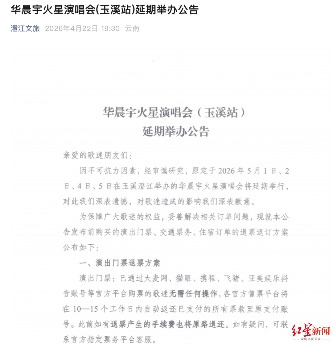 随后,华晨宇工作室发布公告,称受不可抗力因素影响,原定于2026年5月1日、2日、4日、5日在玉溪澄江抚仙湖音乐秀场举办的“2026华晨宇火星演唱会乐园2.0”将延期举行,具体举办时间另行通知。火星演唱会官方微博公布了演出门票退票及交通、住宿补偿方案。