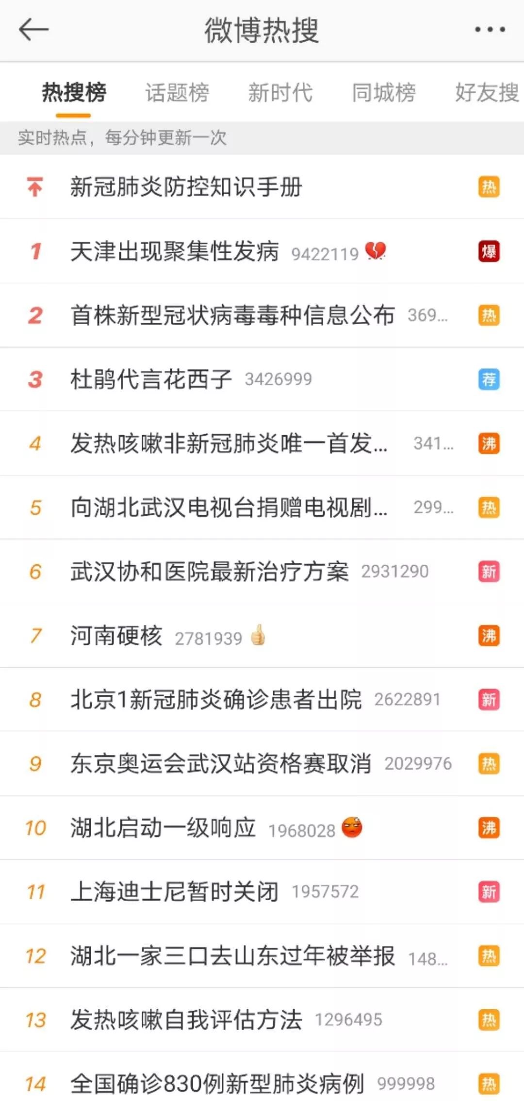 大年三十当天,微博热搜被新型肺炎彻底承包。刷微博时,也大多是关于新型肺炎的各类消息,娱乐信息大大减少,就连春晚节目单的信息也被肺炎疫情的报道淹没。