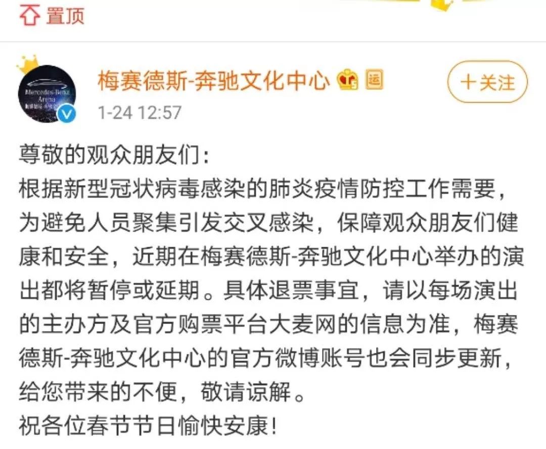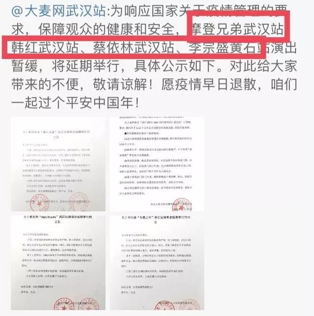 1月22日,大麦网宣布,接武汉有关部门通知,受疫情影响,摩登兄弟巡演武汉站、韩红巡演武汉站、蔡依林巡演武汉站、李宗盛巡演黄石站确定延期或取消。据微博"娱小侠GO"的非官方 消息,"3月份武汉演出项目将全数延期,4-5月份均待审批。"
