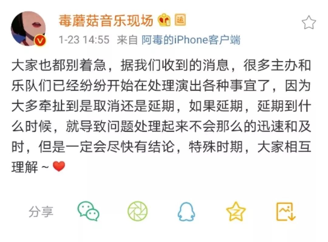 但是,也有个别乐队在近期竟意外公布了巡演日期,并且宣布开票,在巡演城市中,武汉站还赫然在列。根据音乐先声的采访,乐队成员也表示在此时开票实属无奈,至于具体细节我们尚未得知。根据微博音乐自媒体"毒蘑菇音乐现场"的消息,虽然没有正式的官方消息,但是大部分乐队已经开始着手安排演出延期或取消事宜。由于延期演出有着很大的不确定性,故无法迅速向乐迷发出公告,有乐队已经在微博透露演出或延期或取消。