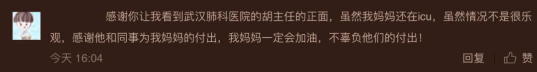刚刚我就看到一条评论说,她妈妈就在重症病房里,因为一直不能进去探病,她一直没有看清医生们的正脸,只能听到他的声音。正好看到我的采访,她才终于知道,治疗她妈妈的医生主任是长什么样子。感谢我做了这样的报道。