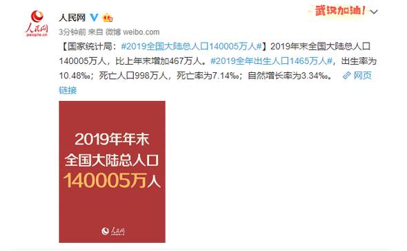 2019年末全国大陆总人口140005万人,比上年末增加467万人。2019全年出生人口1465万人,出生率为10.48‰;死亡人口998万人,死亡率为7.14‰;自然增长率为3.34‰。