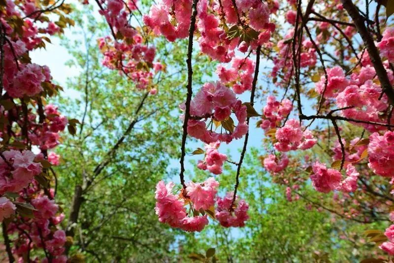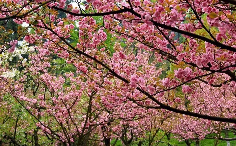 森林公园除了常见的红色、粉色、白色樱花外,还有红蕊绿衣的绿色樱花,十分罕见。这种樱花属于日本晚樱,一般在4到5月开放。