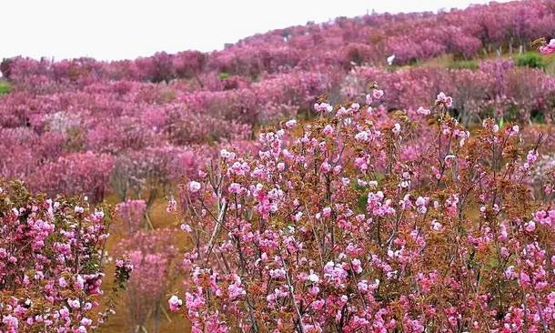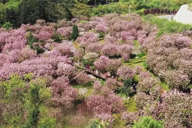 满山的樱花姹紫嫣红,色彩鲜艳,宛如披上绫罗绸缎,成片的樱花林排列有序,层次分明,错落有致。