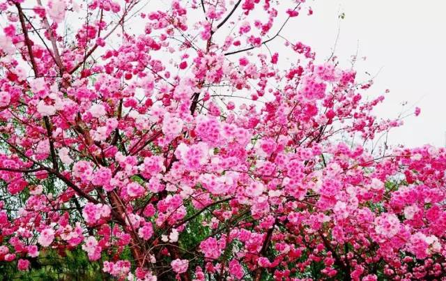 走进樱花园,娇嫩的花朵在枝头上妖娆绽放,满树烂漫。红的、白的、粉的交织在一起,近看娇美可亲,远观迷离醉人,如轻纱、似彩雾。