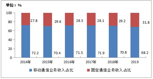 2019年,固定通信业务收入完成4161亿元,比上年增长9.5%,在电信业务收入中占比达31.8%,占比较上年提高2.6个百分点;移动通信业务实现收入8942亿元,比上年减少2.9%,在电信业务收入中占比降至68.2%。