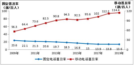 2019年,全国电话用户净增3420万户,总数达到17.9亿户,比上年末增长2.5%。其中因第二卡槽需求基本释放完毕,移动电话用户全年净增从上年1.49亿户降至3525万户,总数达16亿户,移动电话用户普及率达114.4部/百人,比上年末提高2.2部/百人。全国已有26个省市的移动电话普及率超过100部/百人。固定电话用户总数1.91亿户,比上年末减少105万户,普及率下降至13.6部/百人。
