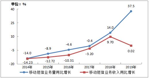 网络登录和用户身份认证等安全相关服务不断渗透,大幅提升移动短信业务量。2019年,全国移动短信业务量比上年增长37.5%,增速较上年提高23.5个百分点;移动短信业务收入完成392亿元,与上年持平。
