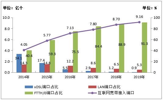推进网络IT化、软件化、云化部署,夯实智慧运营基础,构建云网互联平台,夯实为各行业提供服务的网络能力;4G覆盖盲点不断被消除、移动通信核心网能力持续提升,夯实5G网络建设基础。2019年,新建光缆线路长度434万公里,全国光缆线路总长度达4750万公里。互联网宽带接入端口“光进铜退”趋势更加明显,截至12月底,互联网宽带接入端口数量达到9.16亿个,比上年末净增4826万个。其中,光纤接入(FTTH/0)端口比上年末净增6479万个,达到8.36亿个,占互联网接入端口的比重由上年末的88.9%提升至91.3%。xDSL端口比上年末减少261万个,总数降至820万个,占互联网接入端口的比重由上年末的1.2%下降至0.9%。