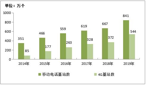 2019年,全国净增移动电话基站174万个,总数达841万个。其中4G基站总数达到544万个。5G网络建设顺利推进,在多个城市已实现5G网络的重点市区室外的连续覆盖,并协助各地方政府在展览会、重要场所、重点商圈、机场等区域实现室内覆盖。