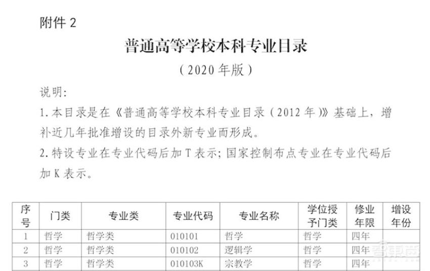 在《普通高等学校本科专业目录(2012年)》基础上,教育部增补了近年来批准增设的目录外新专业,形成了最新的《普通高等学校本科专业目录(2020年版)》,一并予以公布。