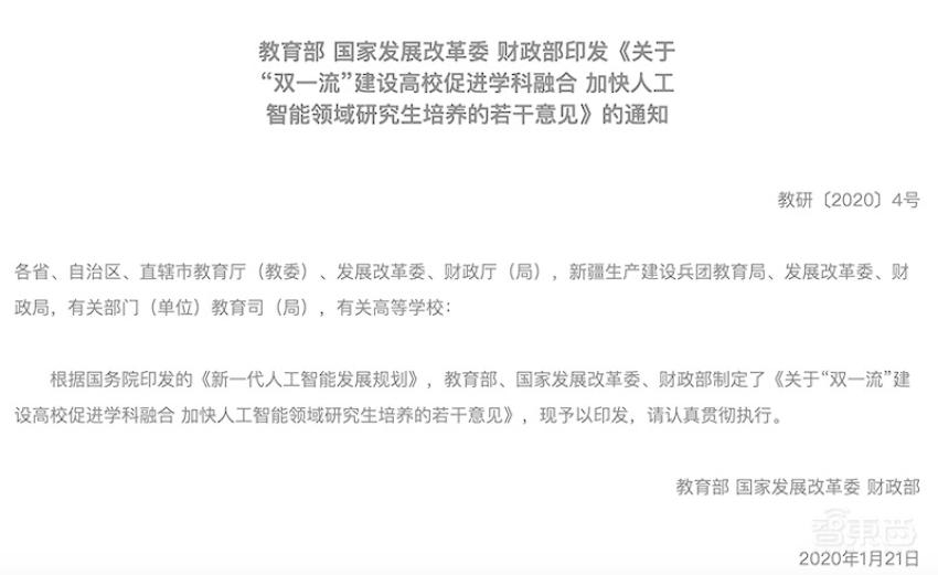 3月3日,教育部官网公开由教育部、国家发展改革委、财政部印发的《关于“双一流”建设高校促进学科融合 加快人工智能领域研究生培养的若干意见》。