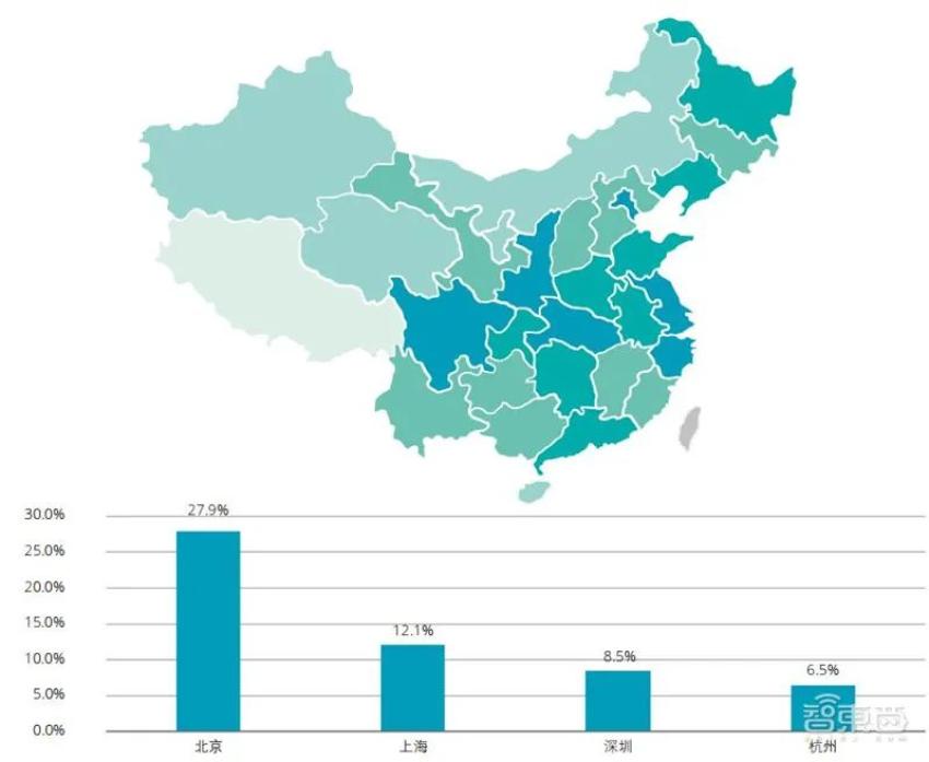 报告分析了北京、上海、深圳、杭州四城的高校资源AI科研实力,从下表中,可以明显感觉到四城AI技术力量之间的差距。