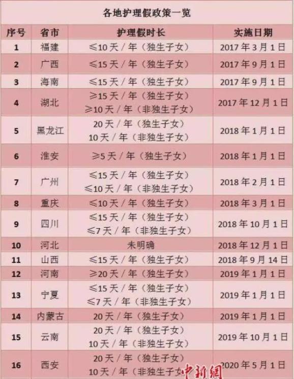 据不完全统计,截至目前,已至少有福建、广西、海南、湖北、黑龙江、淮安、广州、重庆、四川、河北、山西、河南、宁夏、内蒙古、云南、西安在内的16地出台了“独生子女护理假”相关的具体规定。