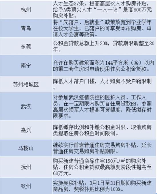 扶持楼市的政策更是此起彼伏。据不完全统计显示,2月以来,已经有60余省市发文扶持楼市。仅3月3日一天,就有广州、常州、温州等三地相继出台新政,其中涉及需求端的支持政策,包括广州商服类项目不再限定销售对象、常州拟调整公积金政策支持首套房贷款、温州人才配售住房最低5折等。