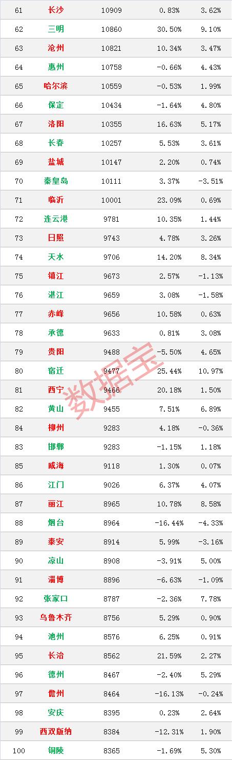 环比方面,广元二手房成交均价环比涨近25%居首,也是唯一一个涨幅超过20%的城市。此外,百色、益阳、三门峡等10城涨幅均超过10%。