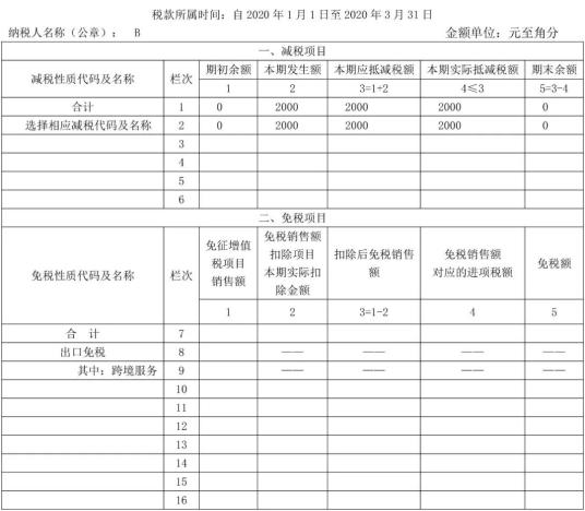 对发生的经济业务进行梳理分类是填报的前提,本案例应先按销售货物和提供应税服务进行分类,将货物销售和提供应税服务行为取得的销售收入以及对应的税款分别计算、填列申报表。本案例中纳税人销售货物实现销售收入为0万元,申报表“货物及劳务”列相关栏次为0。提供的应税服务相关数据应填列至“服务、不动产和无形资产”列对应的相关栏次,其一季度享受的免税额为7000元(10×3%+10×3%+10×1%=0.7万元),应将销售收入与免税额填写至的“免税销售额”(9栏)、“小微企业免税销售额”(10栏)、 “本期免税额”(17栏)和“小微企业免税额”(18栏)等栏次。